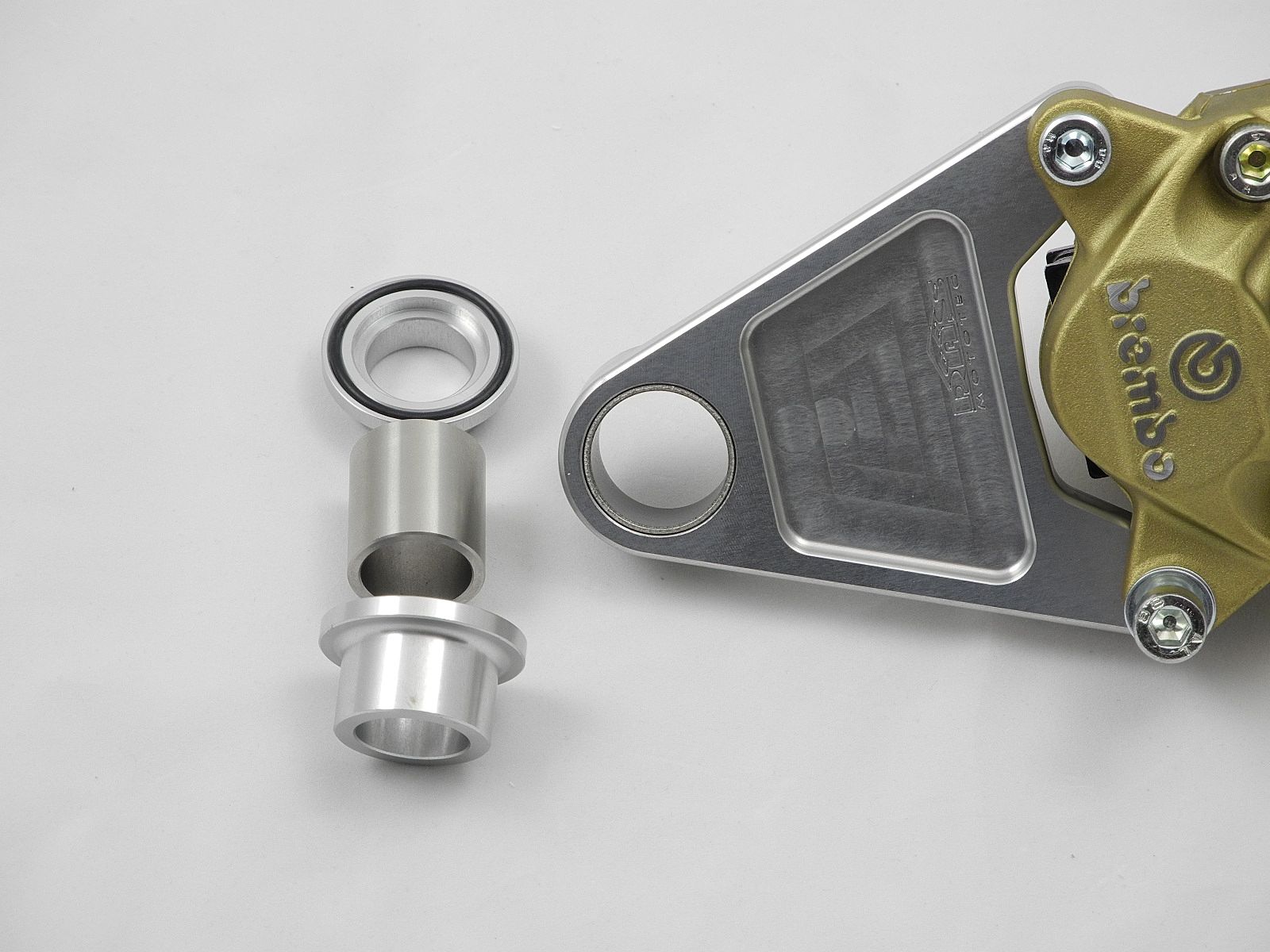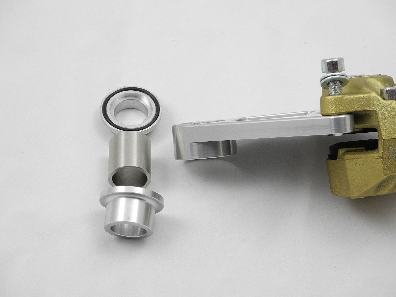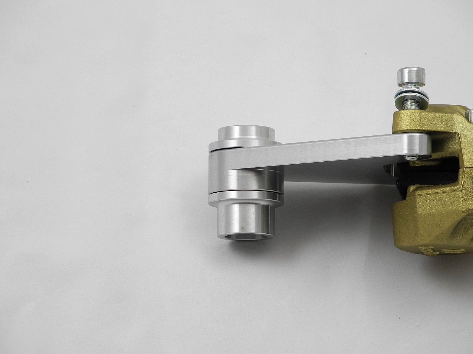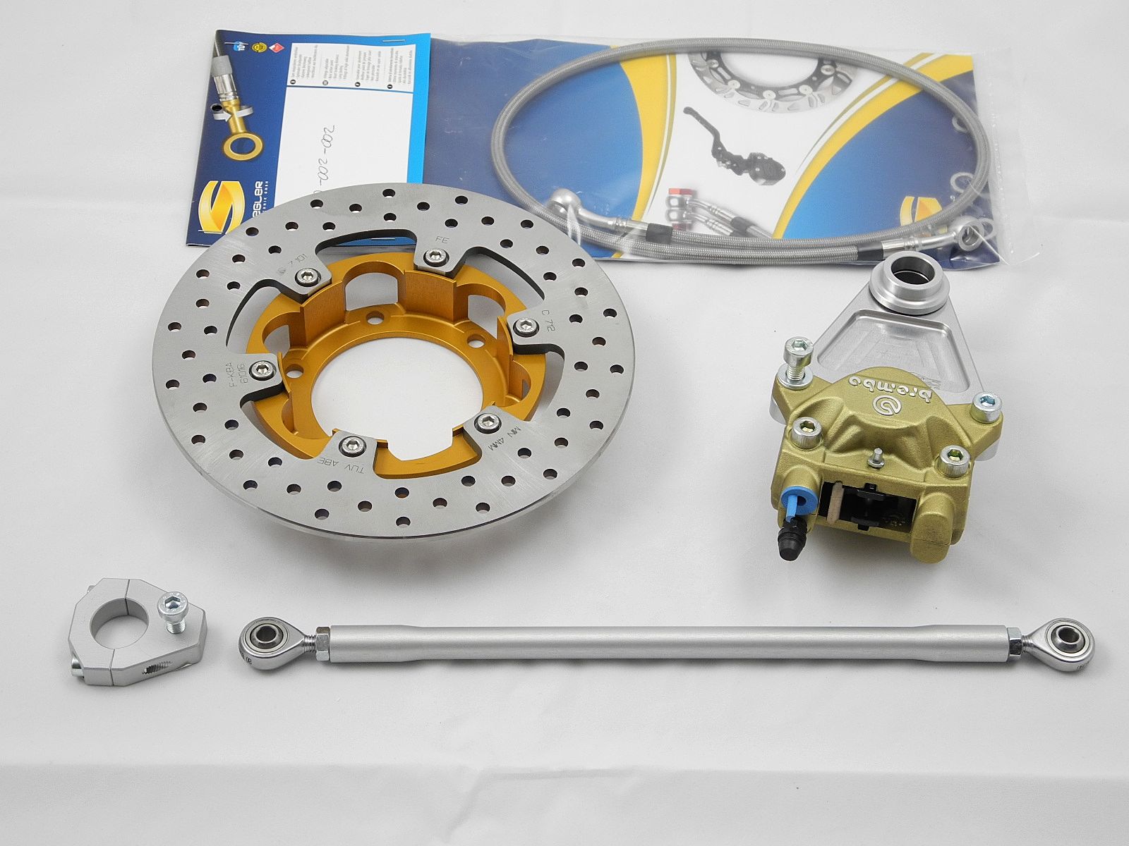 Brembo Bremszange P32F mit schwimmend gelagerter Halterung, passende Distanzbuchsen, Zugstange mit Spielfreigelenkköpfen, Klemmhalter für Zugstange, Stahlflexbremsleitung sowie eine Bremsscheibe Durchmesser 220 mm mit Alu Innenteller