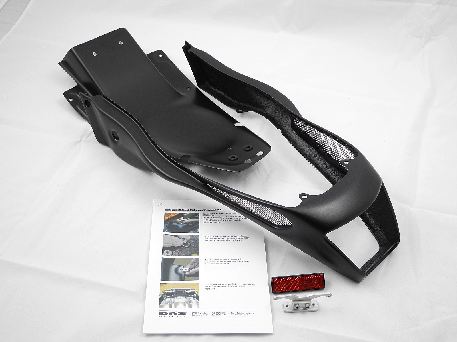 - lackierte Heckverkleidung: Heckverkleidung und Spritzschutz Gfk sind fertig lackiert, gebohrt, die Streckgitter VA sind eingeklebt, Rücklichthalter, Rückstrahler und Befestigungsmaterial liegen bei.