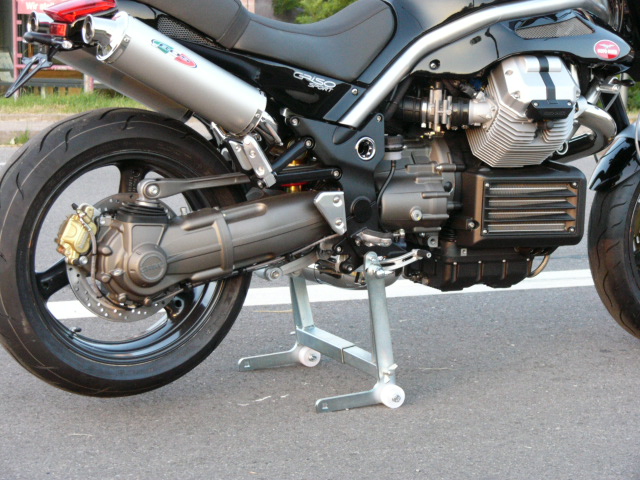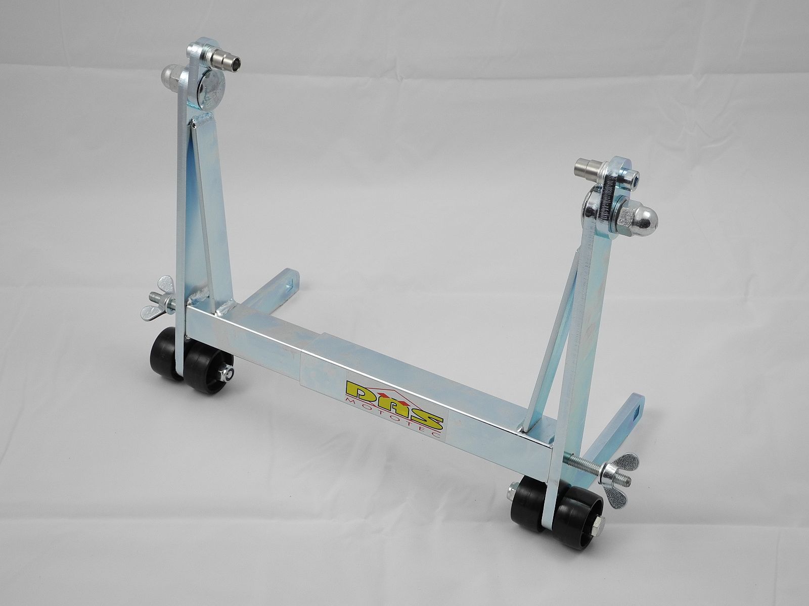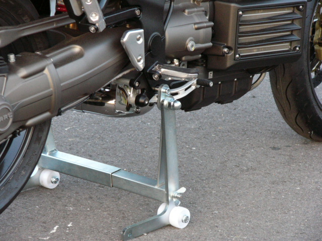 Dieser stabil ausgeführte Montageständer besticht durch seine einfache Handhabung. Die GRISO kann damit leicht von einer Person aufgebockt werden.Mit speziell gefertigten Drehteilen aus Edelstahl wird die GRISO an den zwei konischen Schraubenköpfen der Fußrastenplatten aufgenommen. Der Montageständer ist somit fest mit dem Motorrad verbunden. Das Motorrad kann jetzt wie mit einem Hauptständer aufgebockt werden.