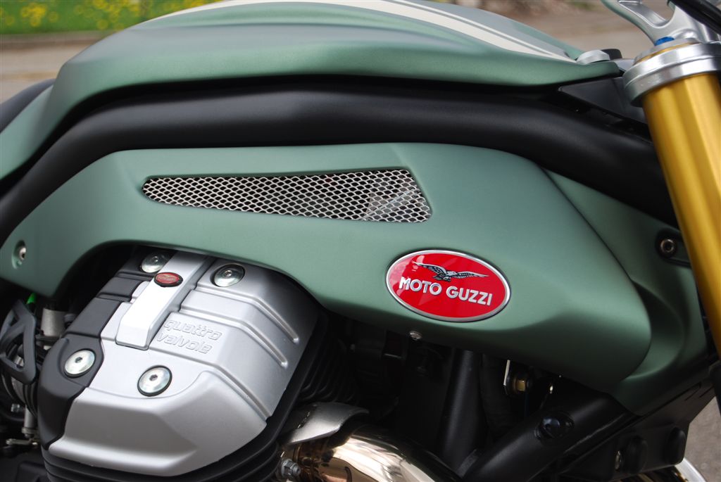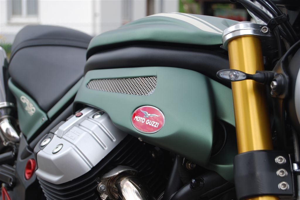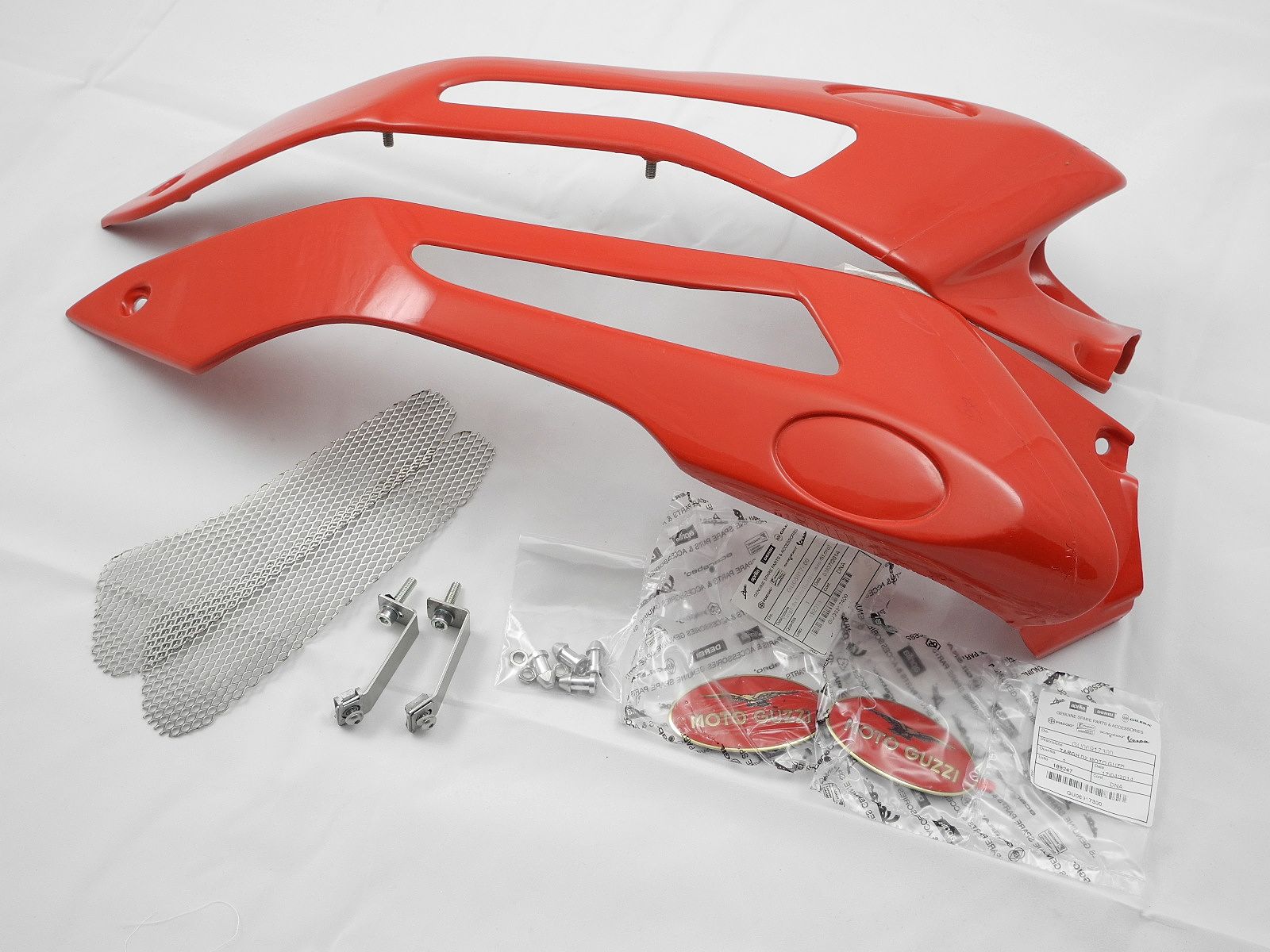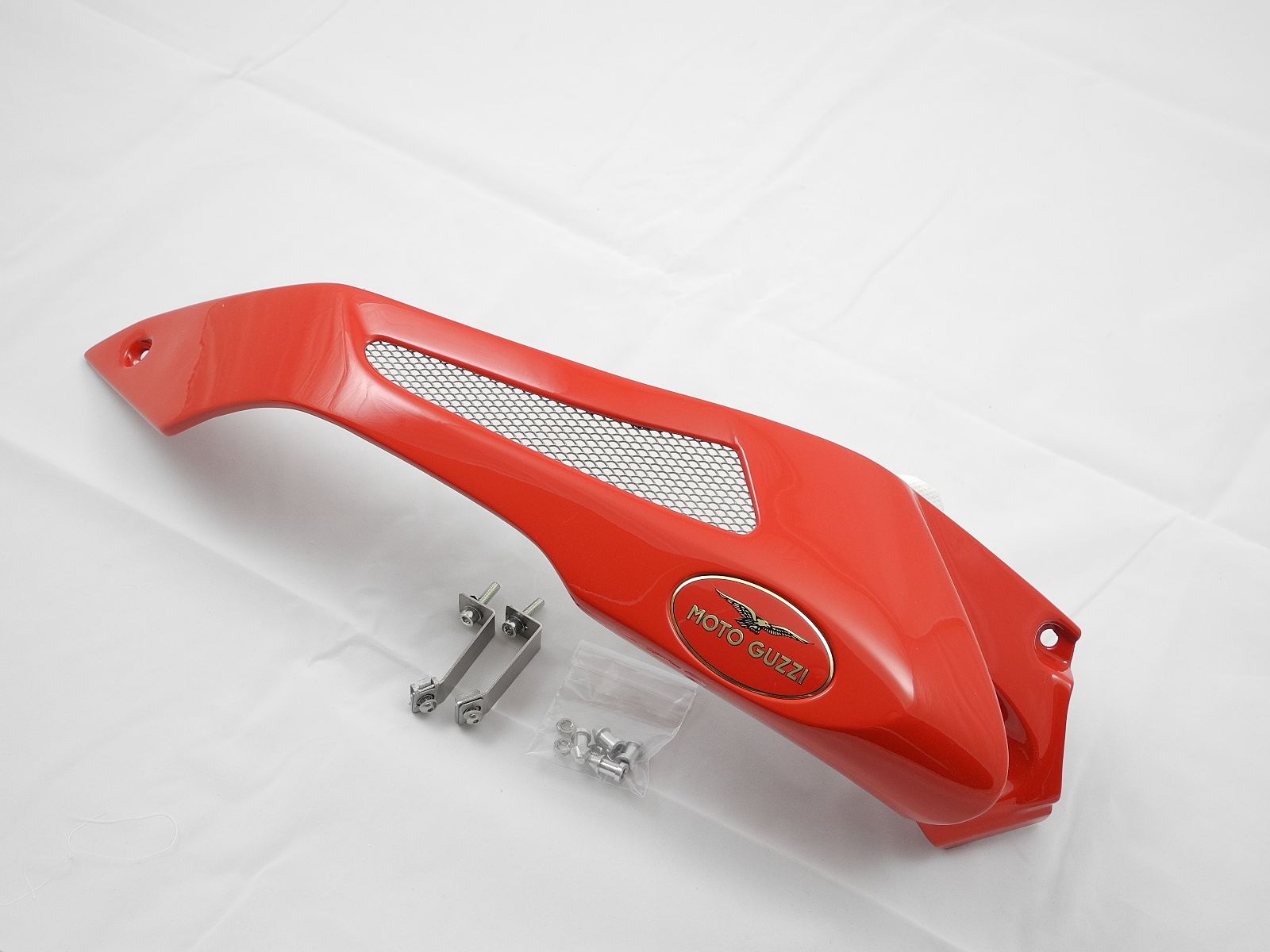 - Die lackierten Seitenverkleidungen werden mit Alu-Aufnahmebolzen, eingeklebten VA-Streckgitter, originalem Guzzi-Emblem und Befestigungsmaterial geliefert.