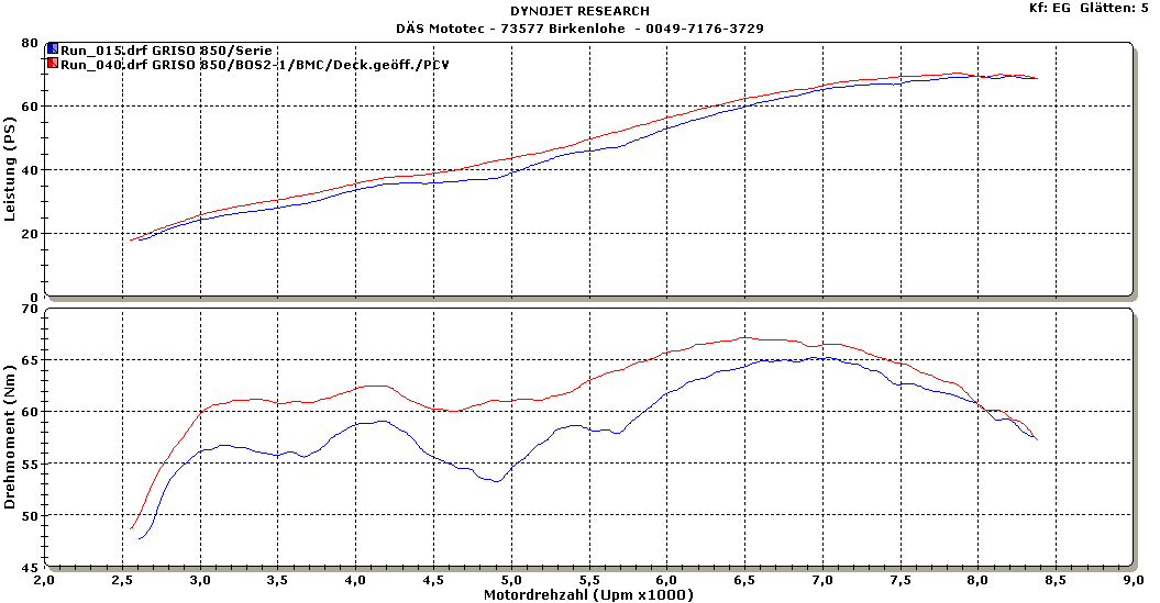 Rote Kurve: GRISO 850 mit DÄS-Kit Stufe 2 (BMC-Lufi, Lufideck. geöffn., DÄS-Mapping, Auspuff BOS 2-1)