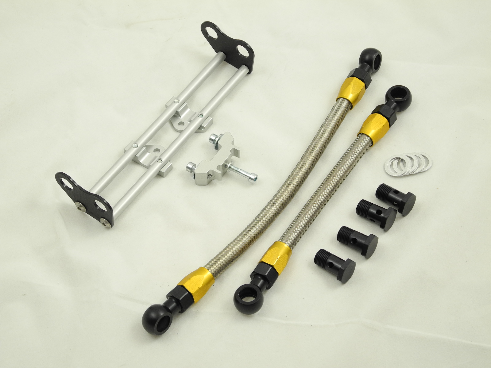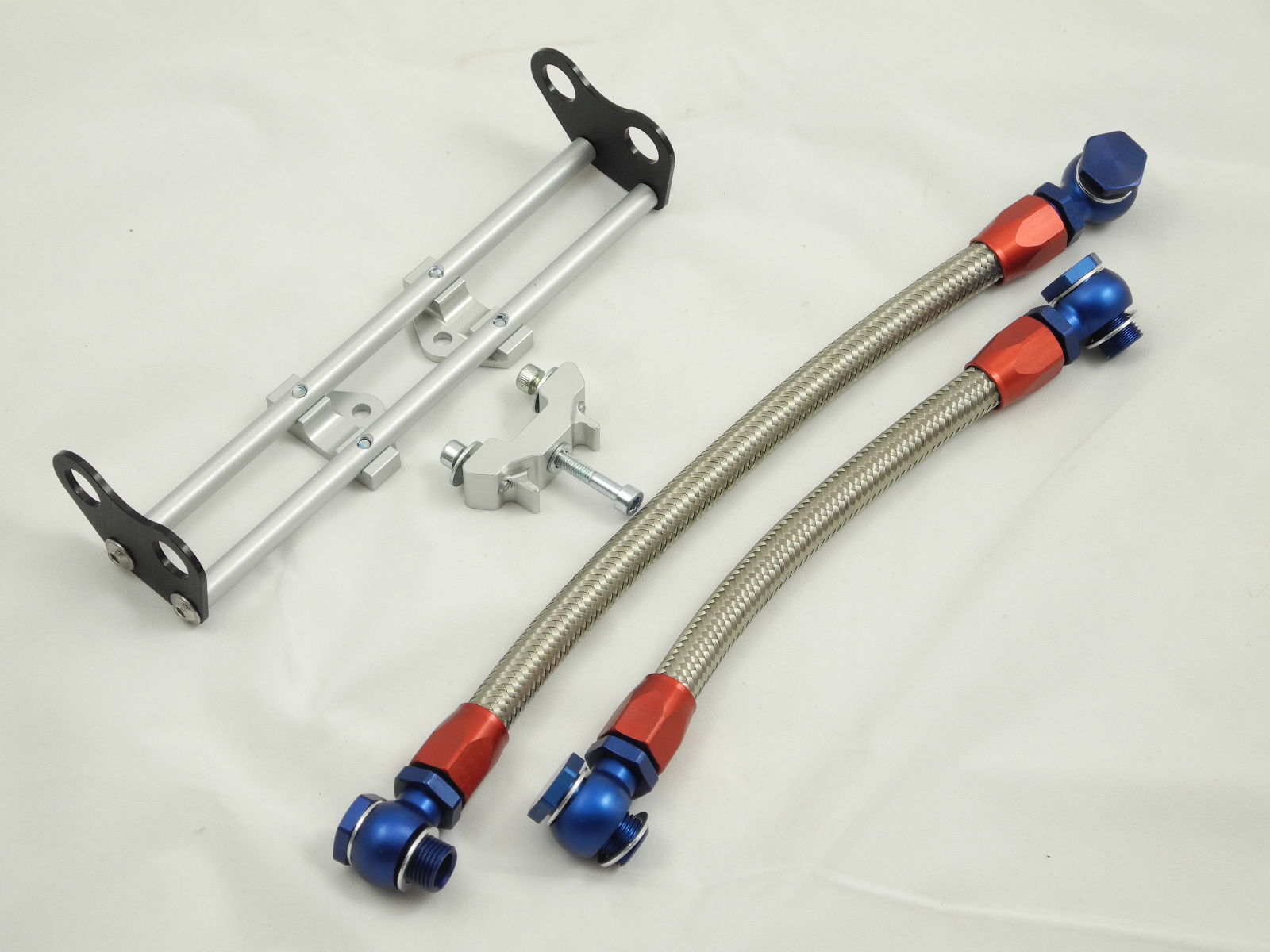 Halterung für Ölkühler, Halteteil für Benzinpumpe und Hupen sowie 2 Ölkühlerleitungen mit Alufittings und Hohlschrauben wahlweise in schwarz/gold oder rot/blau.