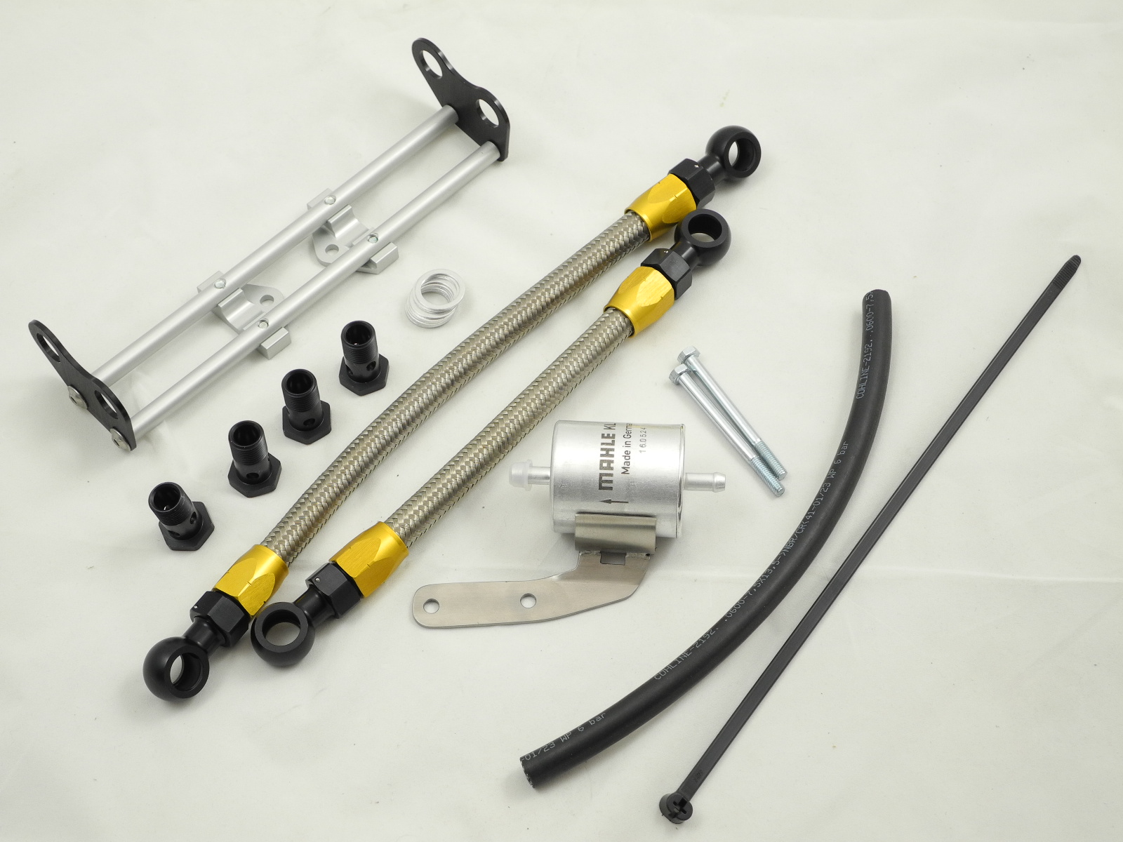 neuer kleinerer Benzinfilter mit spezieller Halterung und Befestigungsmaterial sowie passende Benzindruckschläuche.