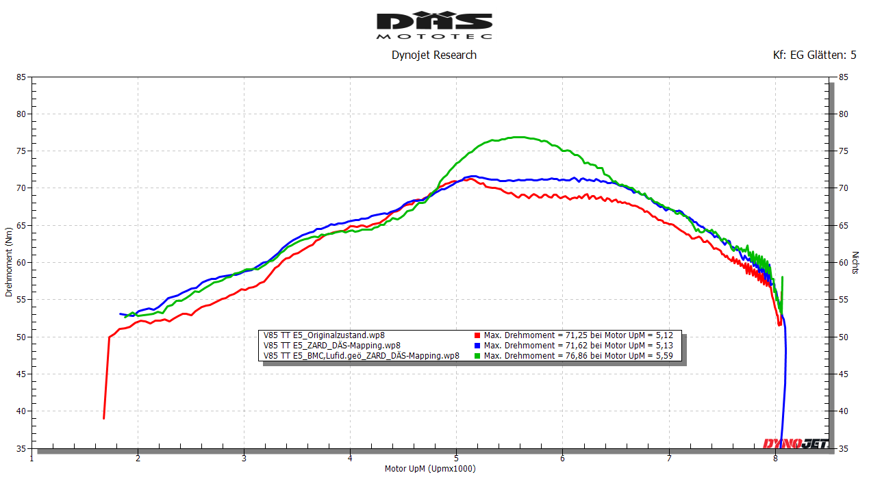 DÄS-Drehmoment-Kit Stufe 1 erreichen wir durch die Änderung an der Ansaugseite (BMC Luftfilter + geöffneter Luftfilterdeckel) einen höheren Luftdurchsatz und damit eine bessere Füllung des Brennraums.